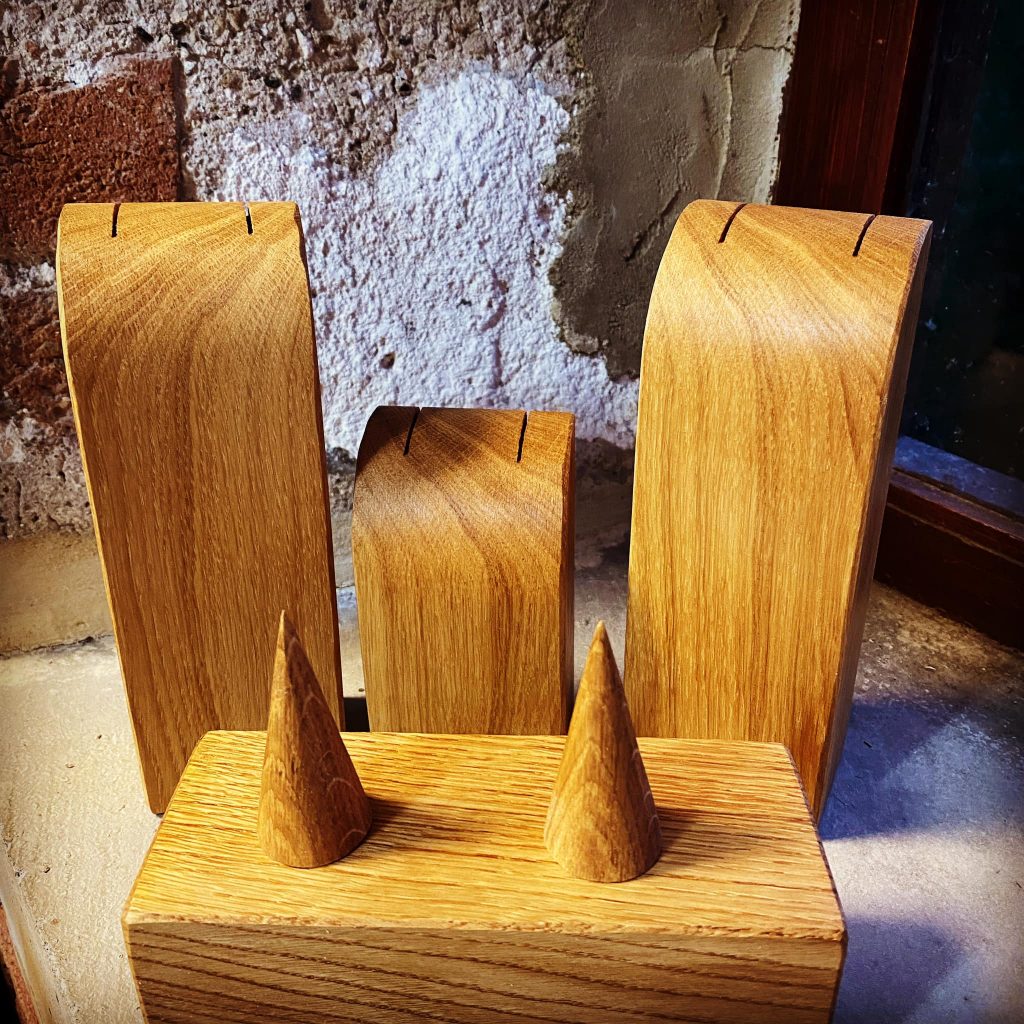 Beautiful hand crafted wooden jewellery displays, handmade by Netty in her workshop in derbyshire. Displays are made from a variety of materials, including oak, pine and laser ply. Displays can be painted or oiled, with your logo professionally engraved onto the wood.